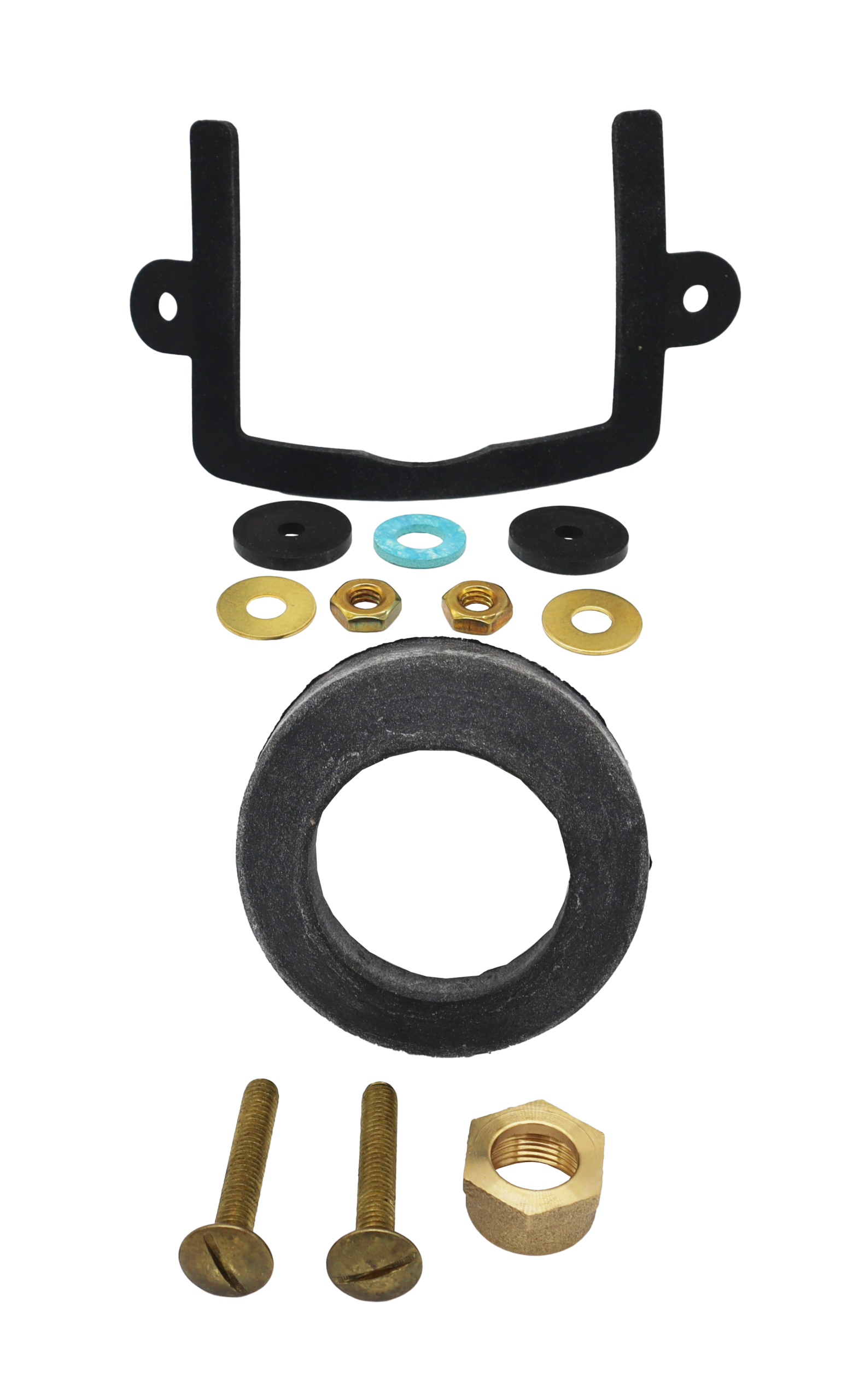 • Two bolts, two nuts, two washers, and the washer and nut to connect the supply line. It also typically includes a U-shaped tank-to-bowl gasket.